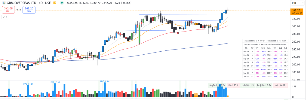 - GRM Overseas – Stock is above its moving averages and standing tall