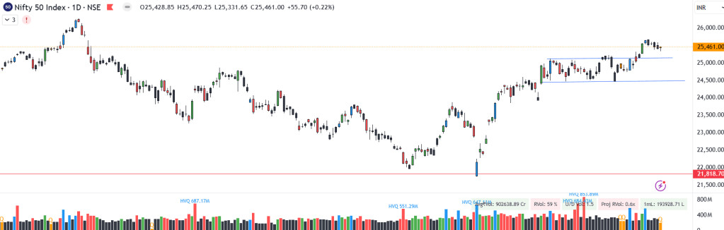 Nifty has broken the range in which it was trading (Blue lines). It would be fair to assume that it can come down to retest 24,500 which was the earlier support. 25,200 will be the first retest, if it does that