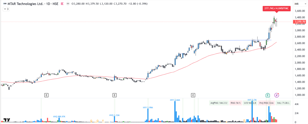 MTAR – The stock hasnβt fallen in the last 2β3 weeks when the markets were volatile. The Q3 results are also out. Though there is no low-risk entry visible at the moment, a small base formation near 3,100 would help create an entry opportunity.
