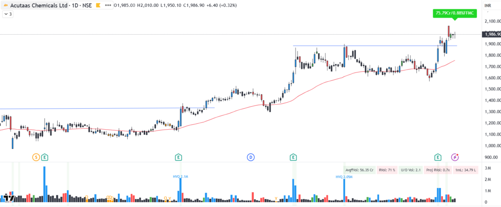 Acutaas Chemicals – A similar structure to Navin Fluorine is forming here. However, I would prefer Navin because Acutaas has been more volatile (it broke the 50 EMA and bounced back), whereas Navin Fluorine has been less choppy.